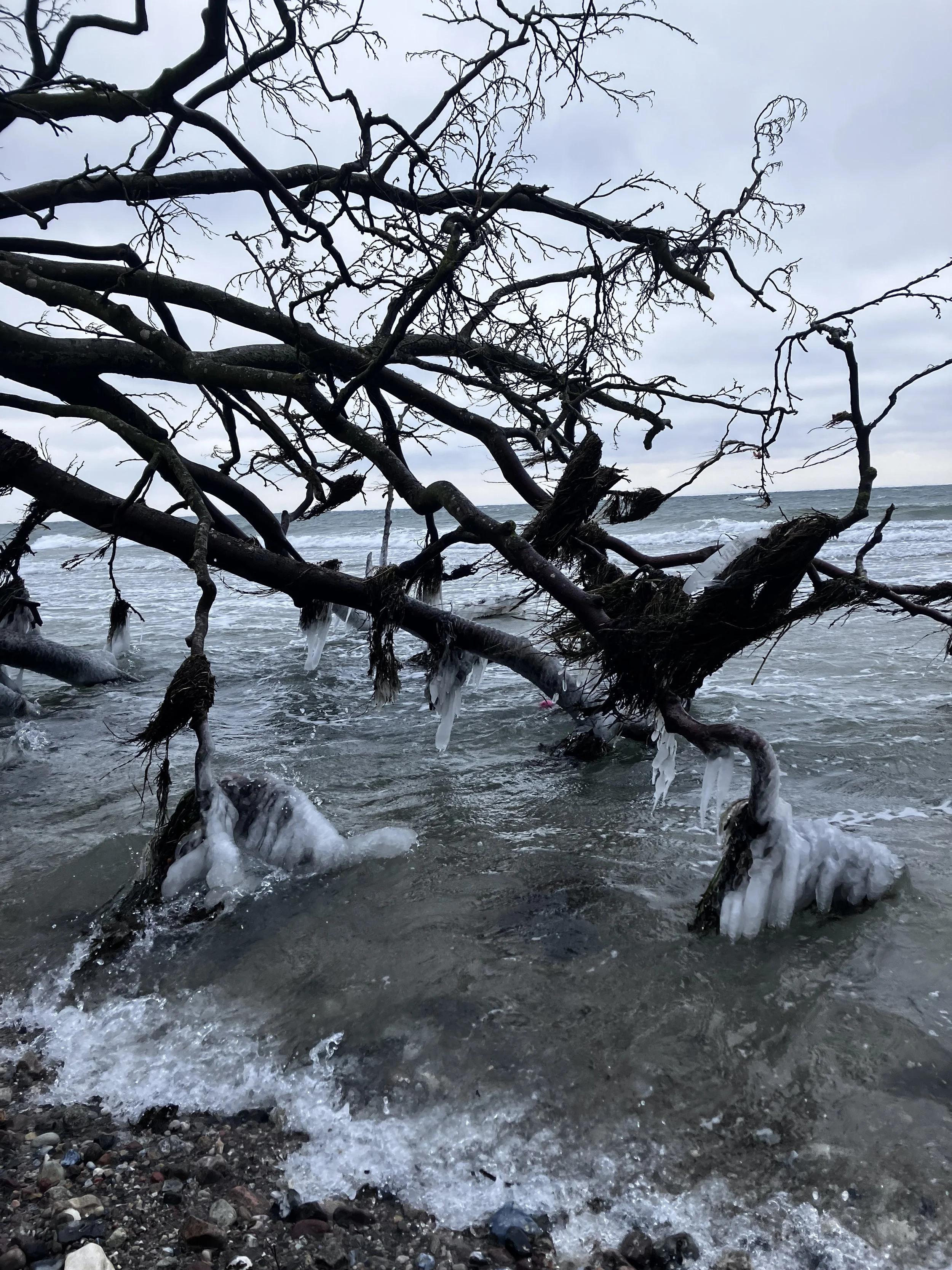 Tag 4: Endspurt in Dänemark – heute ist unser letzter Tag. Nach dem Frühstück in unserem geliebten Häuschen mit Meerblick, schwingen wir uns als dicke Zwiebeln in unser Golfcar und kurven bis zum Waldrand am Strand. Unser Freiluft-Ferrari gerät bei den heftigen Böen ganz schön ins Ruckeln. Zwei Felsen markieren das Ende des Geländes und den Anfang des Waldes. Ab hier heißt es: Aussteigen! Mützen und Schals festzurren, am besten festtackern! Wir kämpfen uns vorwärts, stemmen uns zwischendurch sogar rückwärts gegen die Wind-Wand und entdecken kurz darauf eine gewaltige, entwurzelte Weide. Sie liegt horizontal im Sand, die Krone wird bereits von der Brandung umspült. Ihr Geäst ist total vereist und glitzert beeindruckend.